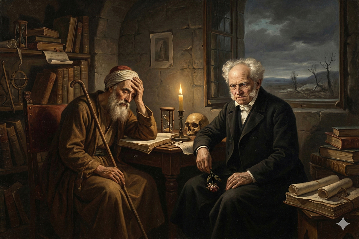 يَلْتقي المَعَرِّي وشوبنهاور عِنْدَ مُفْتَرَقِ التشاؤمِ الوُجوديِّ، بِوَصْفِهِ مَوقفًا مَعْرفيًّا مِنَ العَالَمِ. فالحياةُ عِندهما تَجْرِبة مُثْقَلَة بالأل مِ، والعقلُ مِرْآتها الصافية التي تَكشِف خِدَاعَ اللذةِ، وَوَهْمَ الخَلاصِ السَّهْلِ. إلا أنَّ المَعَرِّي-ابن العُزلةِ والزُّهْدِ- يَرى التشاؤمَ ثَمَرَةَ وَعْيٍ أخلاقيٍّ صارم، إذْ يُخَاصِم العَالَمَ لا لِيَهْدِمَه، بَلْ لِيُحاكمه بِلُغَةِ الشَّكِّ، فَيَنتهي إلى التَّقَشُّفِ الذي يُخفِّف أذى الوُجودِ بالانصرافِ عَنْه. أمَّا شوبنهاور فَيُؤسِّس تشاؤمه على ميتافيزيقا الإرادةِ العَمْياء، حَيْثُ الألَم قانون كَوْني، والرَّغْبَة أصْلُ الشقاء، ولا مَفَرَّ إلا بِتَعليقِ الإرادةِ عَبْرَ الفَنِّ والتَّأمُّلِ.