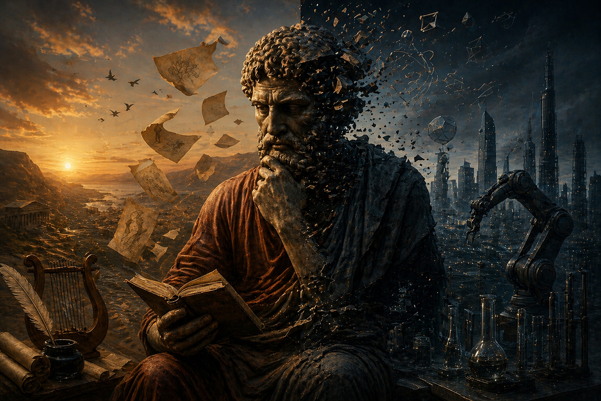 في تاريخ الفلسفة الغربية يتكرر افتراض ضمني يُقدَّم أحياناً كبديهية: كلما اقتربت الفلسفة من العلوم والتقنية، ابتعدت بالضرورة عن الأدب والشعر. يُصوَّر العلم والتقنية كمجال الدقة والحساب والموضوعية، بينما يُصوَّر الأدب والشعر كمجال الغموض والعاطفة والخيال. هذا الافتراض يعتمد على ثنائية تقليدية عميقة الجذور: العقل مقابل الوجدان، البرهان مقابل الاستعارة، التحليل مقابل الإبداع. لكن هل هذه الثنائية ضرورية؟ هل كل فلسفة أخذت العلم والتقنية موضعاً مركزياً في تفكيرها كانت محكوماً عليها أن تبتعد عن اللغة الشعرية والسرد الأدبي؟