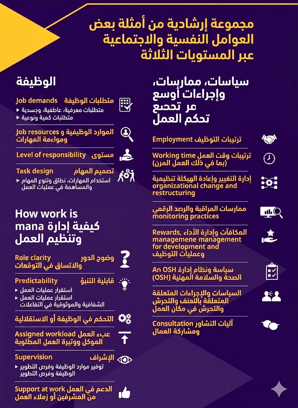 ويطرح التقرير منظوراً متعدد المستويات لفهم هذه البيئة. المستوى الأول هو الوظيفة ذاتها: طبيعة المهام، المطالب المعرفية والعاطفية والجسدية، مستوى المسؤولية، تنوع المهام، معنى العمل، وتوافق متطلبات الوظيفة مع مهارات العامل. المستوى الثاني هو كيفية إدارة العمل وتنظيمه: وضوح الأدوار، توزيع عبء العمل، سرعة الإنجاز المطلوبة، الاستقلالية، الإشراف، التغذية الراجعة، الدعم الاجتماعي، وجودة التفاعلات اليومية. أما المستوى الثالث فهو السياسات والممارسات والإجراءات الأوسع التي تحكم العمل: ترتيبات التوظيف، ساعات العمل، إدارة التغيير، الرقابة الرقمية، نظم المكافآت والترقية، سياسة السلامة والصحة المهنية، إجراءات منع العنف والتحرش، وآليات التشاور ومشاركة العمال. ويوضح الشكل الوارد في الصفحة 23 من التقرير هذا التقسيم الثلاثي للعوامل النفسية والاجتماعية، مقدماً أمثلة عملية لكل مستوى من هذه المستويات.